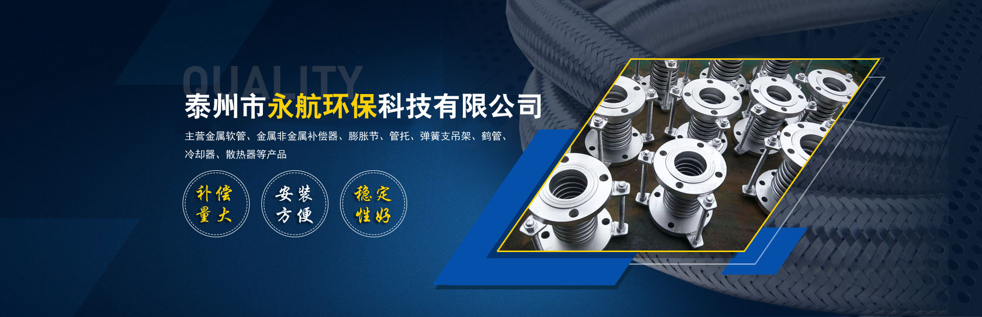 公司專注從事設(shè)計(jì)制造金屬膨脹節(jié)、不銹鋼金屬軟管、波紋管補(bǔ)償器、不銹鋼軟管、不銹鋼波形波紋補(bǔ)償器、矩形補(bǔ)償器、非金屬補(bǔ)償器、冷卻器、換熱器、風(fēng)門、法蘭、管件、墊片、橡膠補(bǔ)償接管、減振器、減振墊和各類高壓軟管產(chǎn)品。